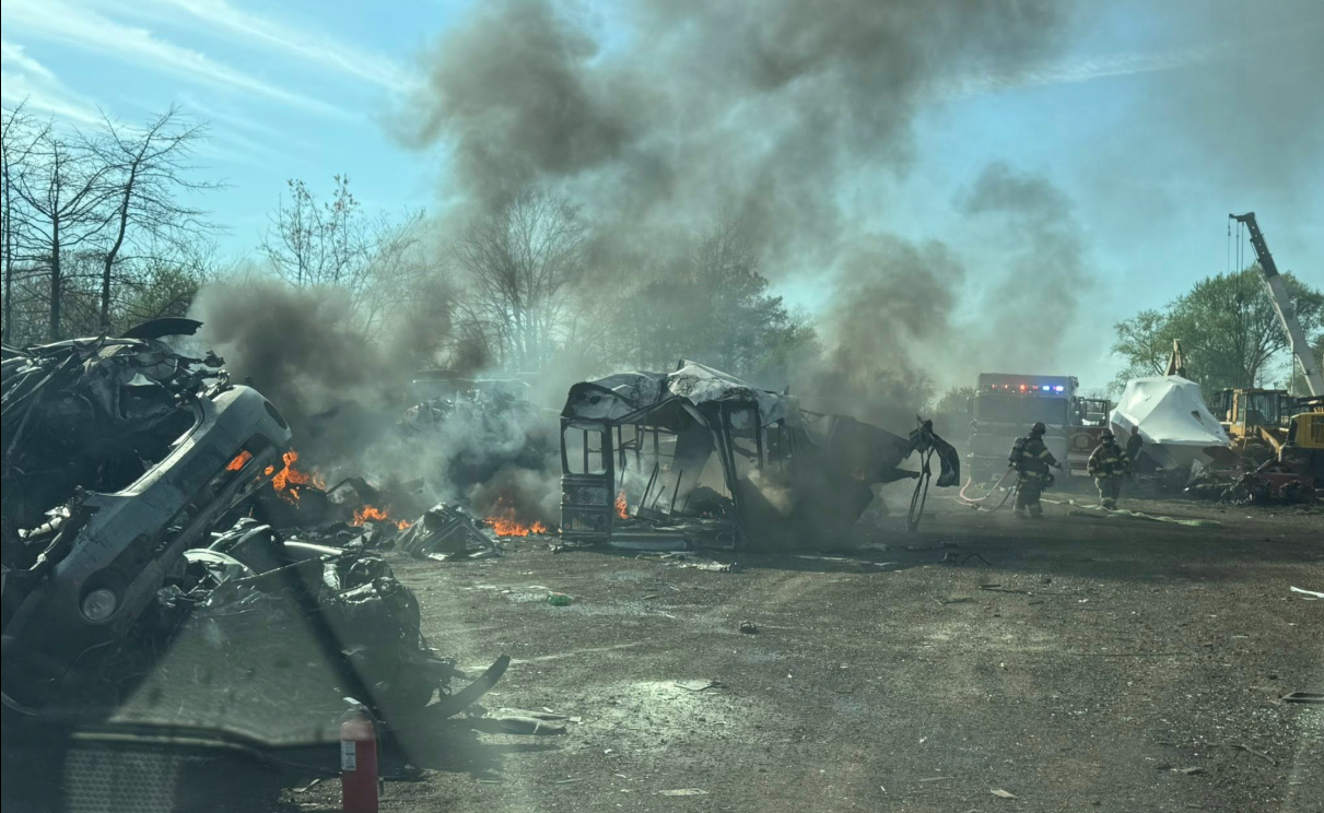 First responders were dispatched at about 4:30 p.m. and found a pile of burning debris and several vehicles engulfed in flames. Because of the nature of the site, the fire chief immediately called for a large water-supply response.